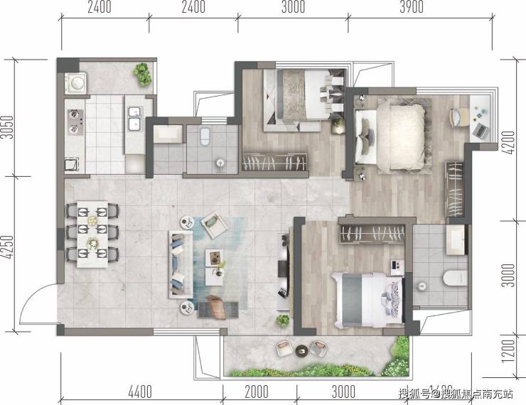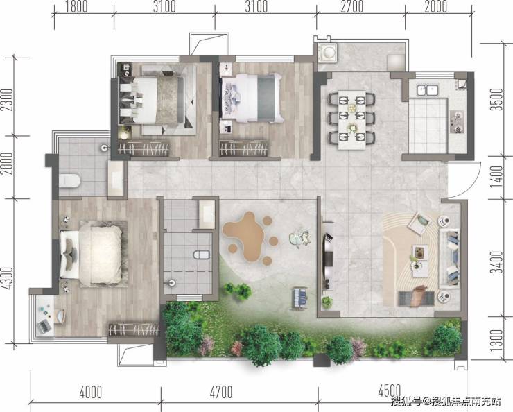 #### 区域唯一小院平层——套三双卫建筑面积约:77.35㎡户型优势: - 70余㎡全功能三房双卫,超前设计在南天府地区罕有,满足家庭不同阶段的需求。 - 约6.4米港式大横厅,约27㎡会客厅,朗阔尺度,彰显生活品质,无论是家庭聚会还是宴请宾客都十分适宜。 - 约5米超长景观阳台,实现客厅、房间均可步入观景,让您与自然亲密接触。 - 阔尺厨房、生活阳台,提供更多可变空间,满足您对生活的多样化需求。 - 双卧室270°全景采光,让风景与阳光时刻点缀生活。