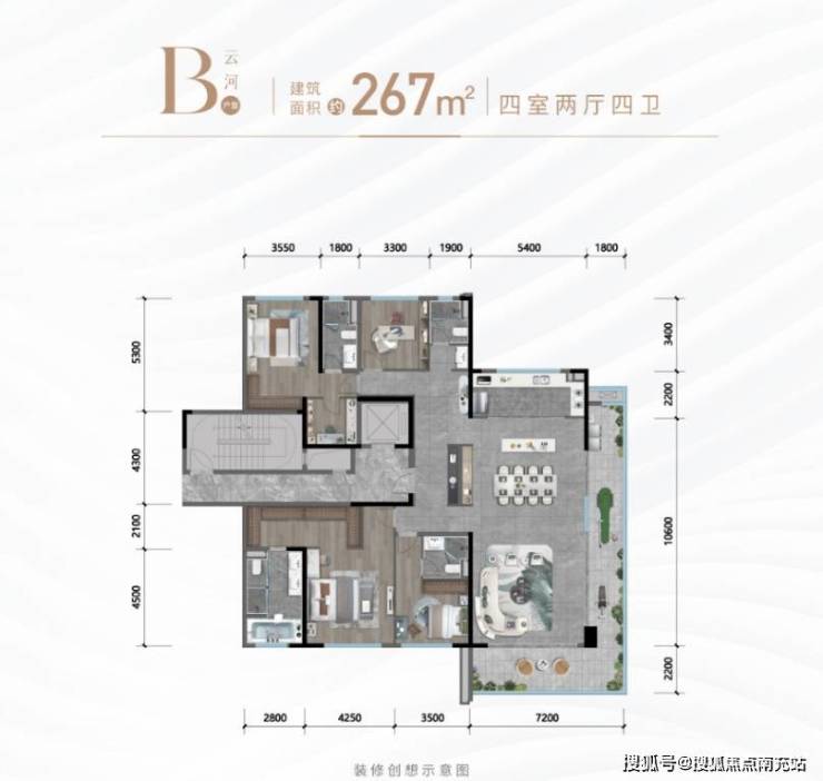 - **户型鉴赏**: - 建面约267㎡云河户型,四室两厅四卫,“揽星邀月,宽境犒赏人生”。