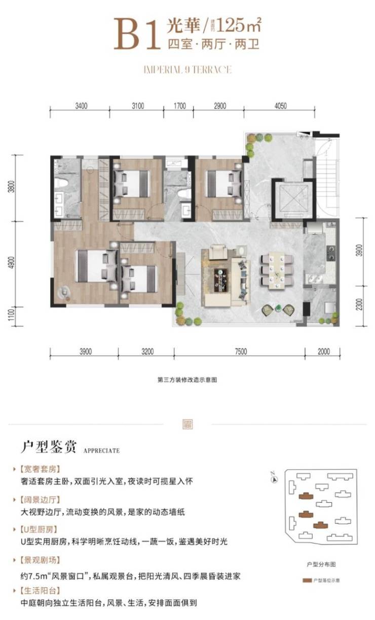 建面约125平套四