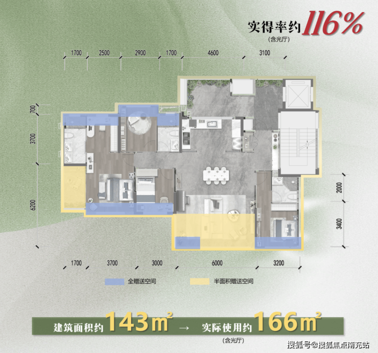 越秀天悦云萃2期,建面143m²,实际使用面积做到了166m²(含入户电梯厅)。