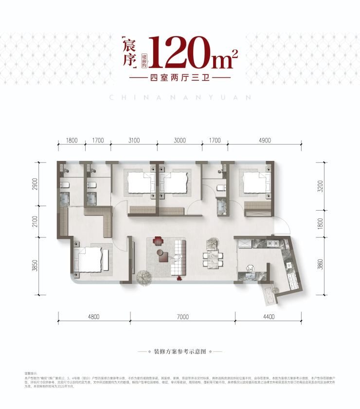 2. 120㎡四室两厅三卫,属于进阶改善主力户型,空间尺度舒适,横厅布局大气开阔,四房设计可满足多孩家庭或三代同堂居住需求。双套房+三卫配置,兼顾私密性与便利性,全屋通透采光,居住舒适度显著提升。