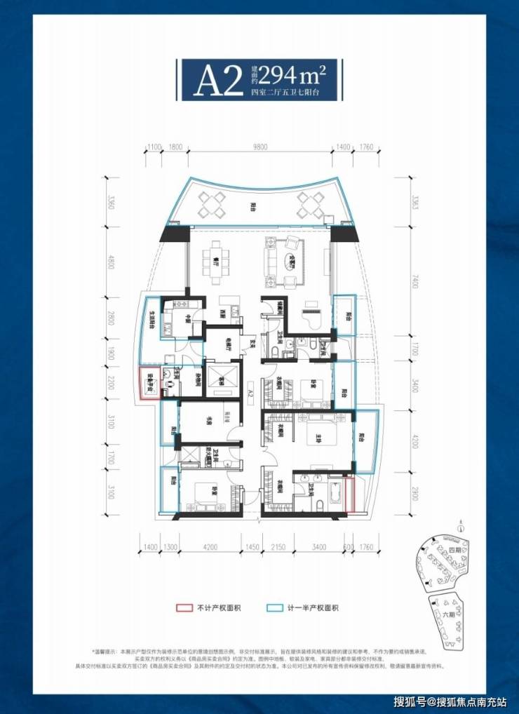 ### 臻品户型解析- **293㎡环幕平层**:5房2厅5卫7阳台格局。270°全景落地窗设计,将锦江湾景与城市天际线完美框入室内。多功能阳台系统实现景观、休闲、家政的完美分区。