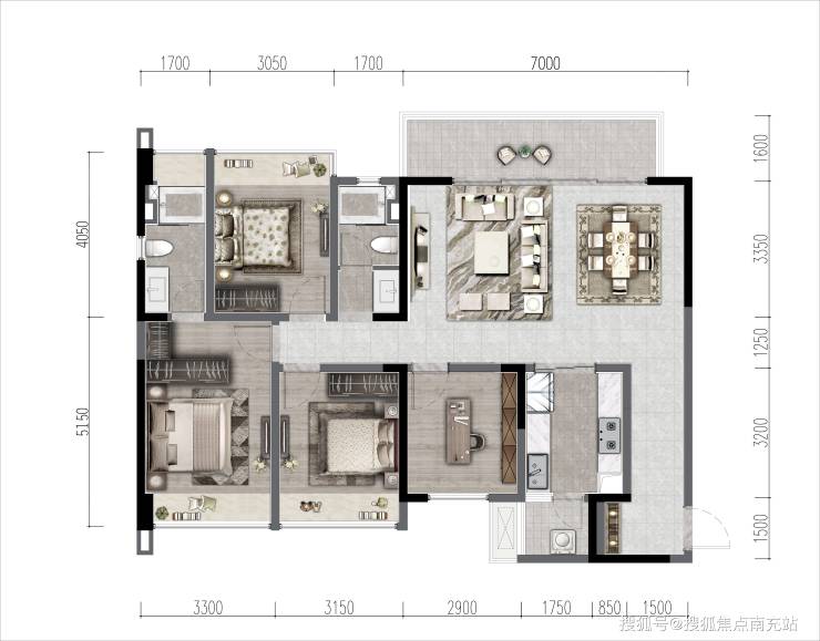 C户型 建面约142㎡ 四室两厅两卫(西北朝向)