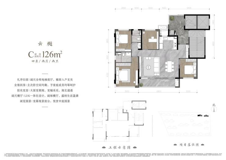 126㎡的户型为2梯2户,独立入户,拥有双面采光的电梯前厅;15米面宽+4.5开间朝南,拥有极好的日照、采光和观景效果;得房率约92%。