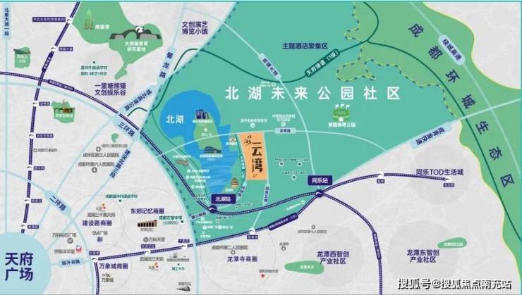 成都首批未来公园社区——北湖未来公园社区中的超百亩湖居大盘,占据整个北湖未来公园社区C位,项目建筑红线最近处与北湖公园湖岸距离仅约65米;