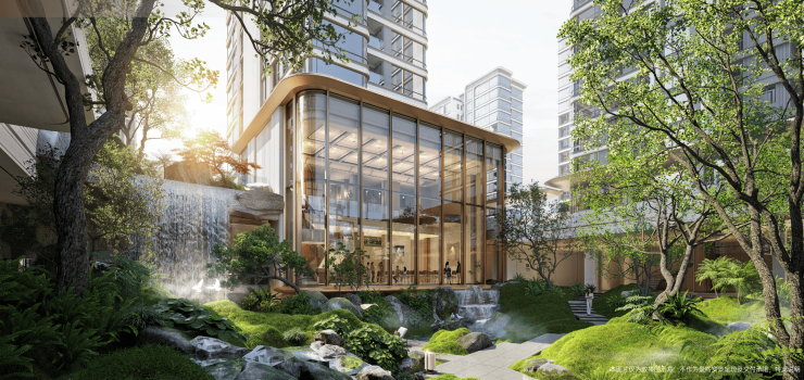 取意九寨之幽、雪山之巍,以现代手法叠山理水,将川西山水浓缩于一园之中