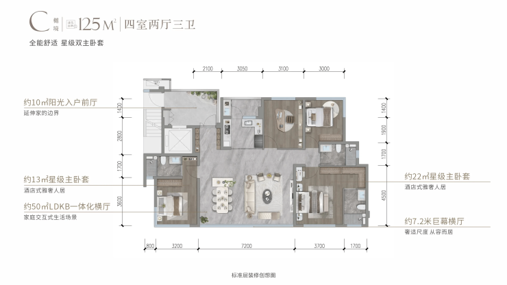 3. 125㎡四室两厅三卫,是项目改善主力户型,空间奢阔、功能顶配,采用双主卧套房+三卫设计,完美解决多代同堂居住隐私性与卫浴使用冲突问题。大面宽采光、LDKB一体化公区设计,让室内空间更显通透大气,主卧套房配备独立衣帽间与豪华卫浴,居住舒适度拉满,全方位满足品质改善家庭一步到位的居住需求。