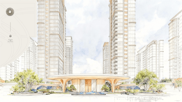 高定社区配套:规划约 1.5 万㎡圆环状中央会所,含恒温泳池、私宴厅、雪茄吧、健身房等高端功能,搭配 18 米挑高行政酒廊与立体垂直园林,全冠移植朴树、黄花梨等名贵树种,社区配置能级领先。