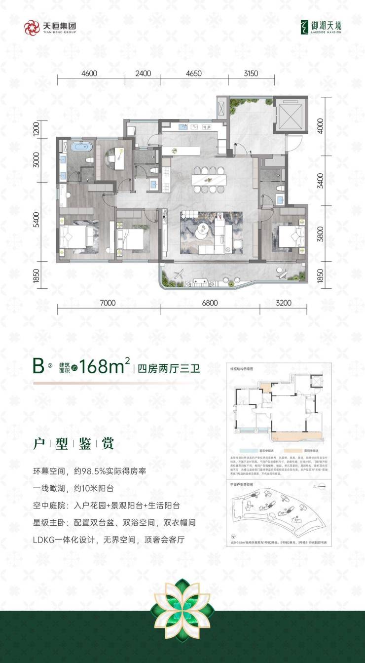 】项目经理热线 13281850333(微信同号)温馨提示:若您希望获得更优质、贴心的接待服务,烦请在看房前提前致电售楼处进行预约!【提供免费看房车接送服务,若有需要,可致电售楼处预约】### 成都天恒御湖天境:都市湖畔的理想栖居之所【基本信息】- 占地面积:61.7亩- 开发商:北京天恒置业有限公司- 容积率:整体1.5(住宅部分仅1.25)- 绿化率:30%- 公摊:19%,还赠送12平入户空间- 梯户比:2梯2户- 得房率:98%- 车位:443个,设有商业独立车位区- 楼层:11F- 装修状态:精装交付,装修标准3000元/㎡,配备三大件- 产品类型:住宅8栋,共220户;商业4栋(包含商业街、星级酒店)- 物业:天恒物业- 物业费:4.2元/平- 产品层高:3.1米- 价格:143㎡户型总价330 - 350万,168㎡户型总价430 - 460万,196㎡户型总价630 - 640万,单价区间在2.3 - 3.2万- 交房时间:2026年6月,拿地时间为2023年9月- 面积:主力户型包含143平、168平、196平。并且每个户型都有一楼带花园的房源,花园面积约50 - 130平,价格待定