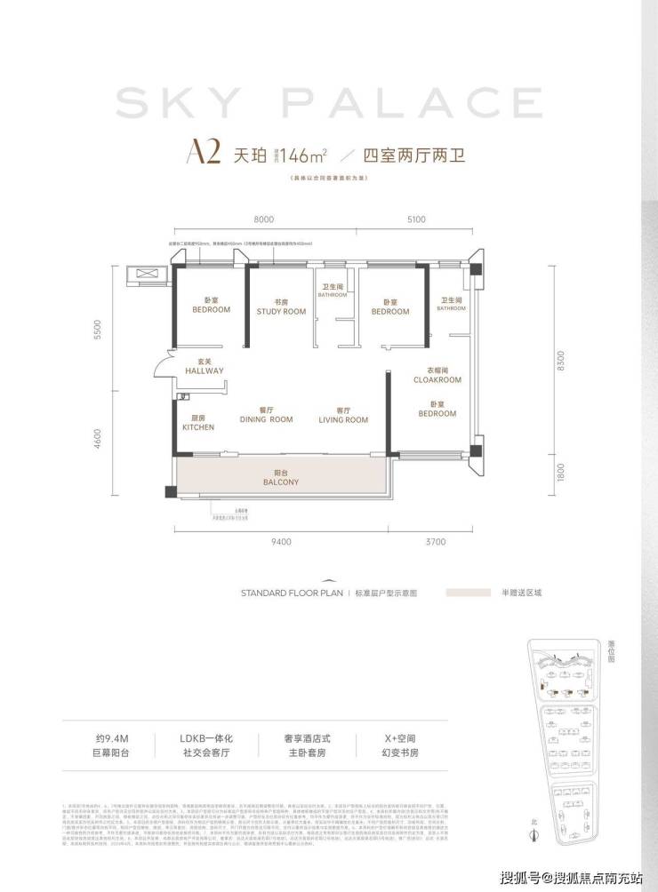 **A2天珀户型(建面约146㎡ 四房两厅两卫)** - 约9.4米景观阳台,采用空中花园设计,增添生活的浪漫氛围。 - 阔绰的LDKB厅堂,是多功能的社交空间,满足各种生活场景。 - 星级主卧套房,让业主奢享高品质生活。