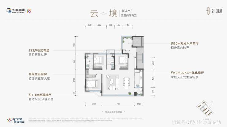 建面约104㎡ 云境 三室两厅双卫(清水)2T2户纯板式布局,约11㎡阳光前厅私梯入户,约7.1m开间巨幕横厅,星级主卧套房