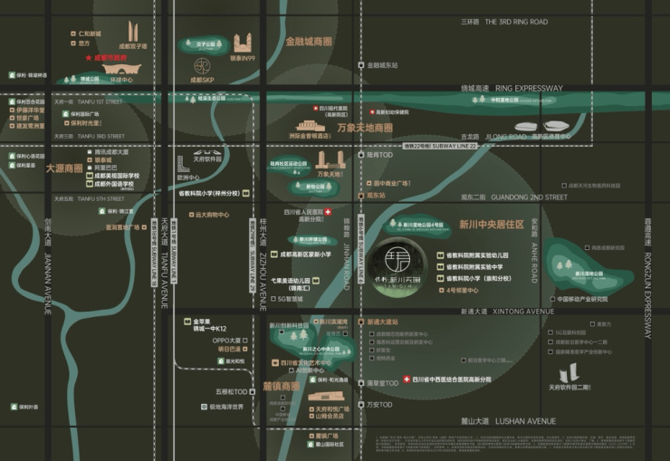 项目周边商业资源丰富。约3公里范围内形成了新川潮奢生活圈,这里有西南首个万象天地(建设中)、文艺潮流MALL明日巴适、蓝润置地广场、远大购物中心等,能让您尽情享受24小时缤纷生活场景;约7公里范围内涵盖金融城商圈、环球商圈,像银泰IN99、悠方购物中心、仁和新城购物中心、环球中心、SKP等商业综合体汇聚于此,为您带来万象缤纷的生活体验。