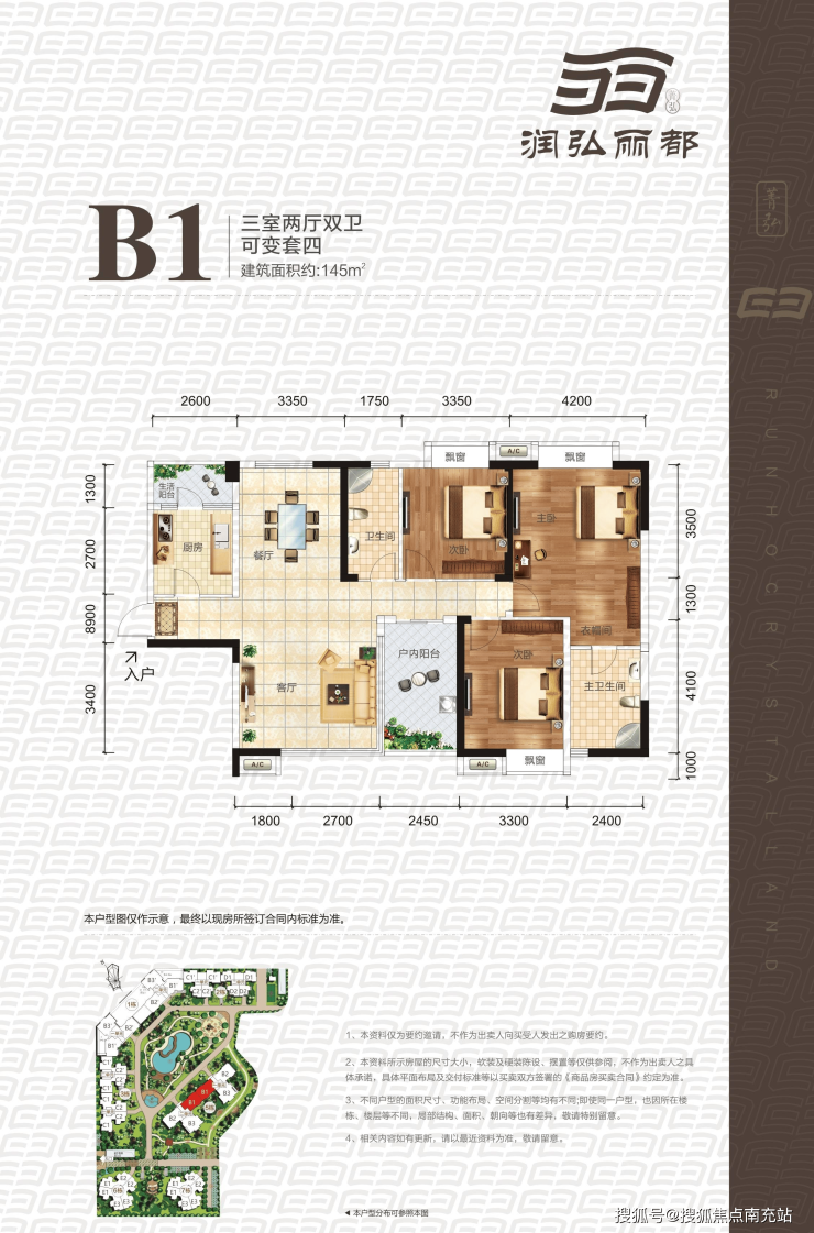 5栋共18层,2个单元,2梯3户,建面约145㎡套三可变套四户型;
