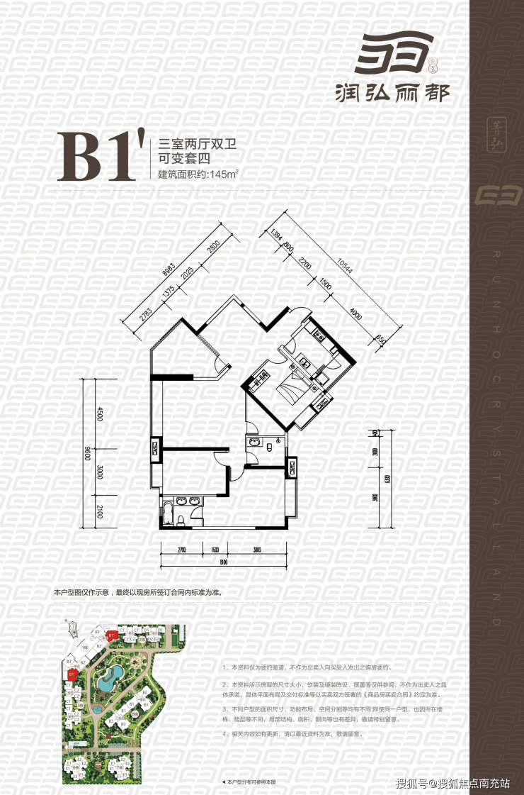 1栋共30层,2个单元,2梯3户,建面约145-146㎡套三双卫、套三可变套四户型(B1’约145㎡套三可变套四、B2’ 约145㎡套三可变套四、B3’套三双卫);