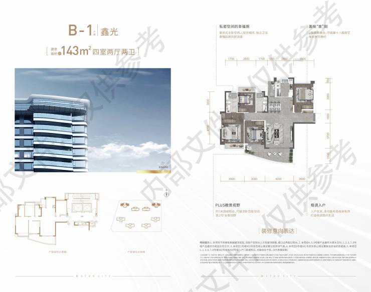 B-1户型属于建面约143平米的主流户型类别。在空间设计上,它配备了约7米的奢华宽敞阳台,能够提供270°的全景视野,让居住者可以尽情欣赏室外的优美景致。此外,主卧采用了套房式设计,不仅带有L型衣帽间,满足居住者多样化的衣物收纳需求,还配备独立卫浴,为居住者营造出舒适、私密的个人空间 。