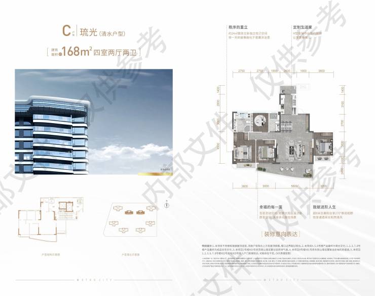 在售户型中,楼王户型是建面约168平米的C户型。该户型亮点突出,配备了超8米的巨幕阳台,可带来270°的广阔景观视野。如此设计,不仅使室内采光极为通透,阳光能毫无阻碍地洒满房间的每一个角落,还能让轻柔的微风自由穿堂,为室内营造出舒适宜人的居住环境。套房式主卧面积约24平方米,为业主精心打造了独立的私人空间,让业主可以尽情享受属于自己的惬意时光。厨房采用H型双操作台设计,简约而实用。这种设计不仅方便烹饪操作,还能让厨房收纳更加有序,提升了厨房空间的使用效率。值得一提的是,户型中设有百变灵动空间。观景大阳台与次卧相连,进一步优化了居住空间,让居住场景更加多元。业主既可以在阳台上欣赏户外美景,也可以在温馨的次卧中享受宁静,充分满足了不同的生活需求,极大地提升了居住品质 。