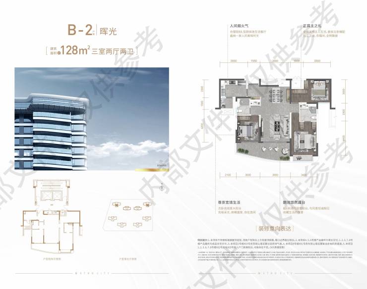 B-2户型是备受欢迎的畅销户型,建筑面积约128平米。此户型亮点颇多,首先是配备了超6米的阔尺观景阳台,次卧与之相连,极大地拓展了空间视野与居住的舒适度。主卧设计更是精心,不仅设有独立卫浴和衣帽间,满足业主的私密生活与收纳需求,还带有全明飘窗,为室内引入充足的自然光线,营造温馨明亮的居住氛围 。