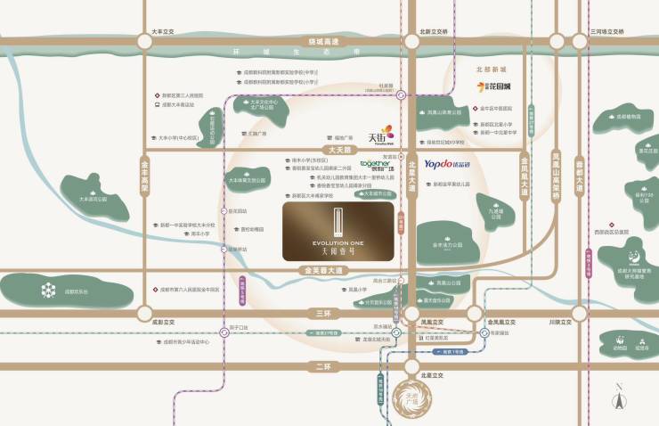 三横是三环路、金芙蓉大道和绕城高速;三纵是金丰高架、北星大道和大天路,开车25分钟可到达百亿商圈春熙路。