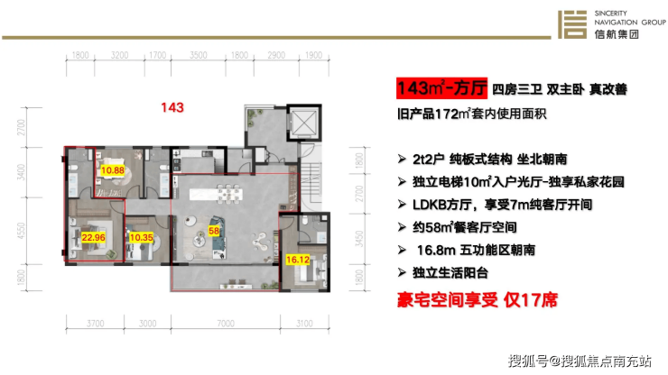 3. 143㎡四室两厅三卫(方厅):改善爆款户型,LDKB一体化方厅设计,公区奢阔大气,社交与居家互动感拉满,双主卧套房+三卫配置,多代同住互不打扰,纯板式南北通透,全屋全明采光,是改善家庭一步到位的优选。