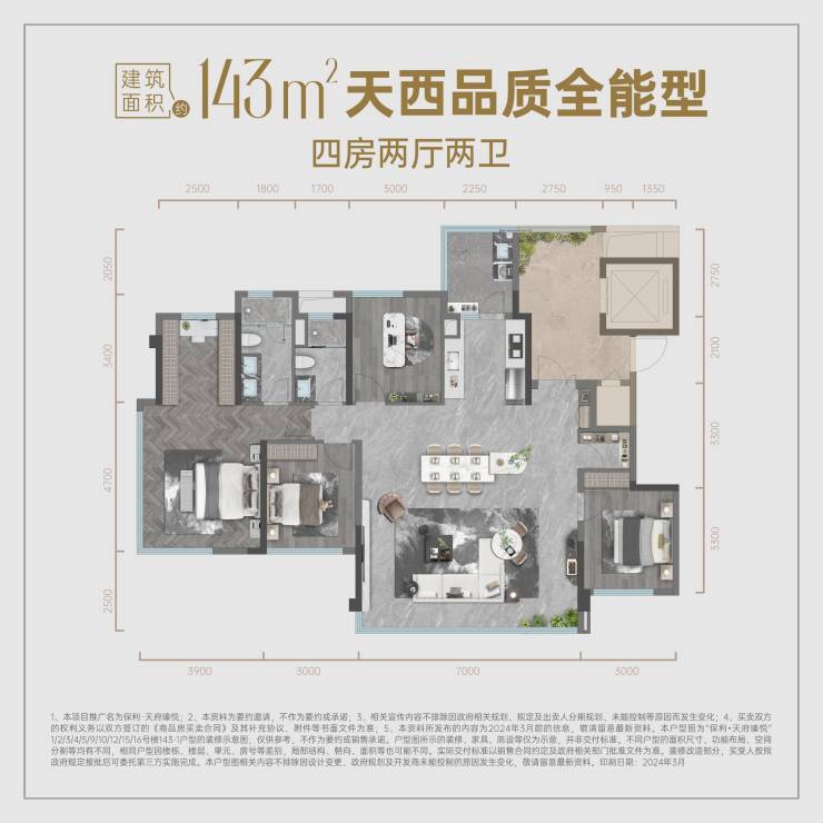 5.产品能打:2.3低容纯板式(1T2/2T2),120-188㎡全系四房,143㎡7米大方厅+中西双厨,188㎡8米环幕横厅+双套房,2999元/㎡精装带三大件