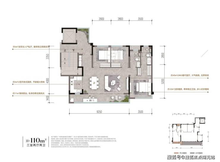 更为可贵的是,凭借国企的责任担当与创新精神,项目打造了建面110 - 143㎡的三大明星户型,为想要在主城改善居住条件的客群,提供了极具竞争力的置业之选:建面约110㎡三房两卫户型: