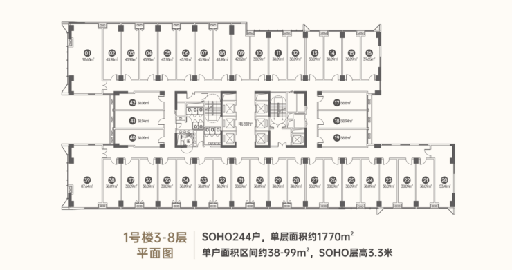 建筑面积约42257.46㎡,总计1000户,其中LOFT420户,SOHO580户。