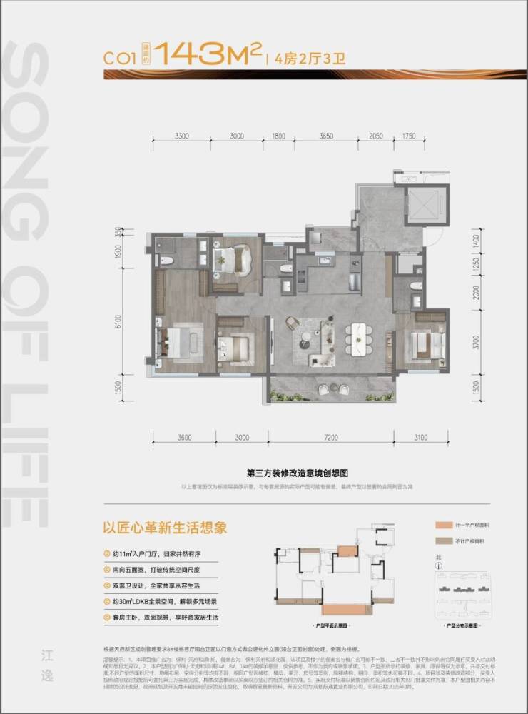 户型设计:有户型面积约123-199平方米的全四房产品,满足改善需求。如143平方米户型,有约11平方米独立入户门厅,7.2米开间阔尺横厅,采光通风好,双套卫设计提高生活效率。