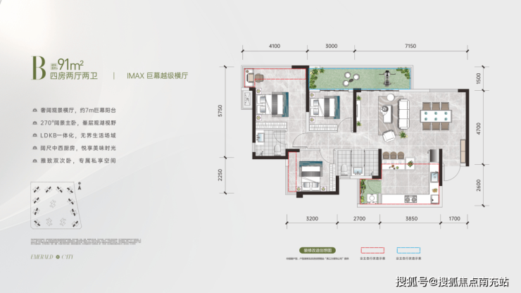 · 建面91㎡(实得约120㎡):创新四房格局,30%超高得房率,7.15米全景横厅