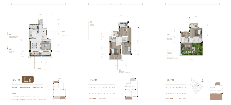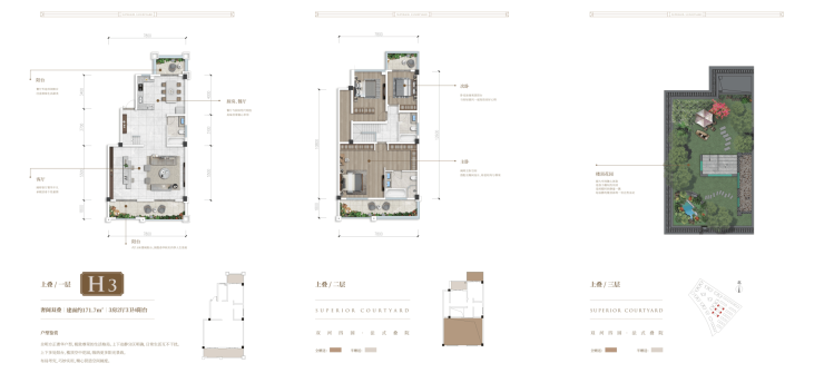 上叠(三层):建筑面积约212平米,星空大露台,上中下三层,空间灵活,私密主卧独享花园。
