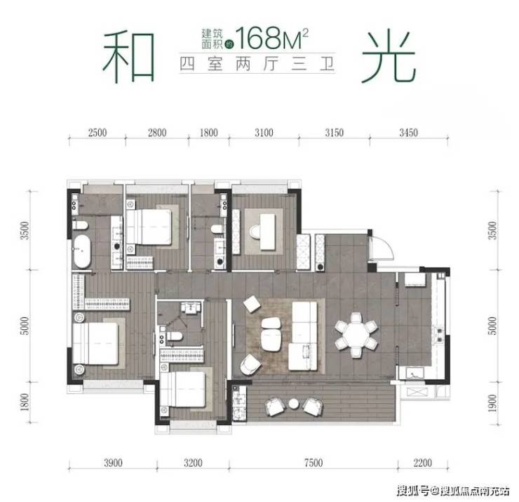 户型设计方正,标准层高 3.15 米,媲美顶豪标准。有 138㎡四室两厅两卫、168㎡四室两厅三卫、175㎡四室两厅三卫等多种户型可供选择。