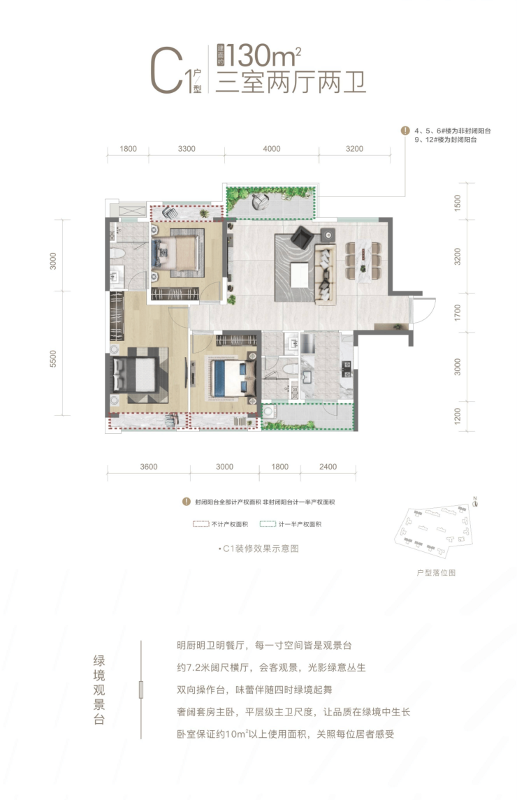 C系列:套三双卫户型(129/130㎡)一个为横厅,一个为竖厅