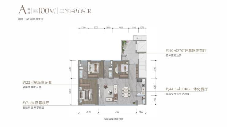 建面100平套三