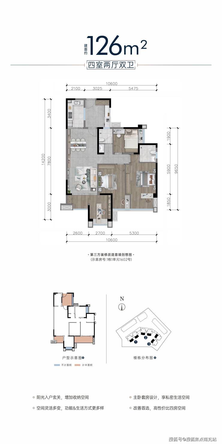 · 126㎡阔绰四房(A6):独立家政间+双套房设计,满足改善型居住需求