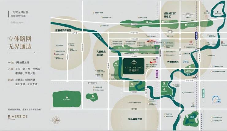 交通:主干道——项目北侧天府一到五街,元秀路以及项目南侧的华府大道以及警校路,东侧的剑南大道、益州大道和天府大道都是直连绕城直达三环,通达全城。
