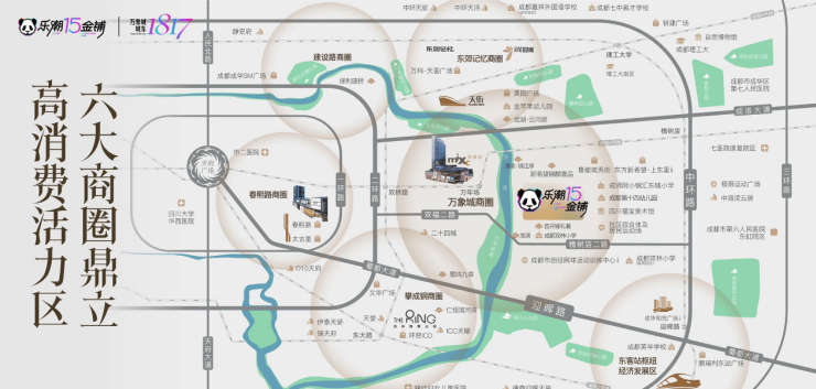 6大顶儫宅圈域+1817亩板块后续高端楼盘客流,周边4个初级改善楼盘客流,周边2个商业塔楼年轻需求客流,3所学校客流