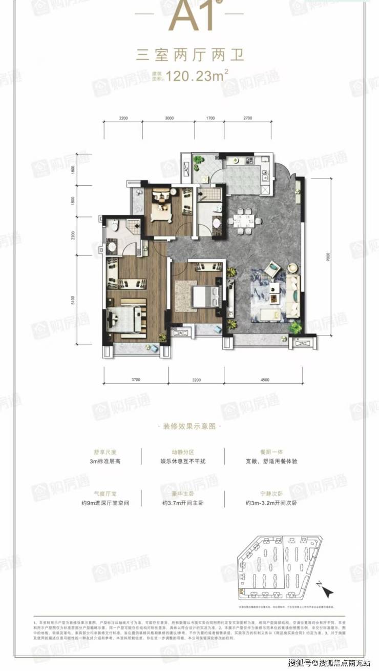 面积约120㎡套三双卫,客厅长达到8.9m,宽4.5m,竖厅设计