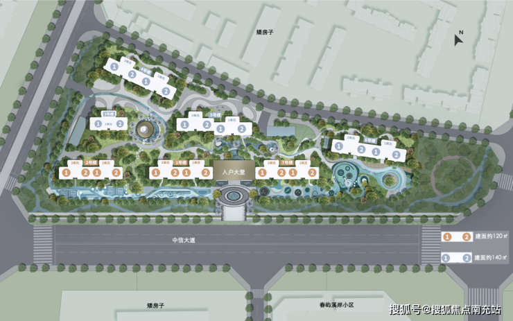 **项目布局规划户型**项目推出建面约120㎡套三双卫和约140㎡套四双卫两种户型,均为大尺度的改善户型。全部采用2T2户南北板式结构,层高约3.1米。为了优化视野效果,户型采用错列布局。周边多为矮房子,楼下又有带状超长中庭,因此大部分户型都能同时欣赏到中庭绿化和城市霓虹两种不同景观。