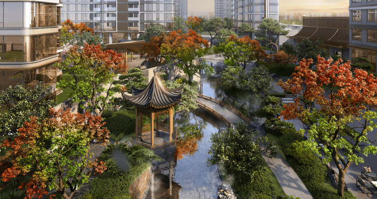 以宋式门仪为序,打造四重归家礼序:一重宽境大门,融合飞檐斗拱与奢石铺装,立序归家气场;二重园林步道,沿松风竹影漫步,步移景异;三重单元门户,人脸识别入户,私密尊崇;四重环岛车库,以光引导归家,仪式贯穿始终。
