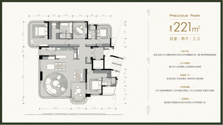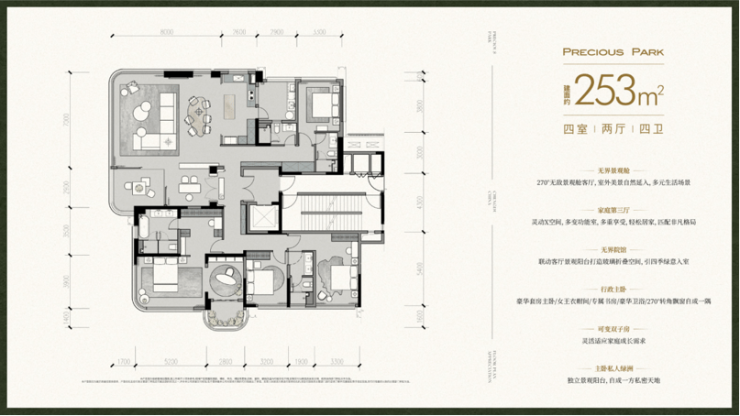 5.户型设计优越:全部户型都能轻松改五房,满足全生命周期居住需求。如253㎡户型通过L型端厅实现270°环幕视野,199㎡户型整体面宽约21.9米,电梯入户的约23平全能光厅可灵活利用。