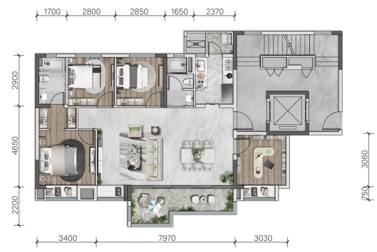 精装标准亮眼:2899 元 /㎡装标,标配中央空调、地暖、新风三大件,装修细节把控到位,省去自行装修成本与时间。