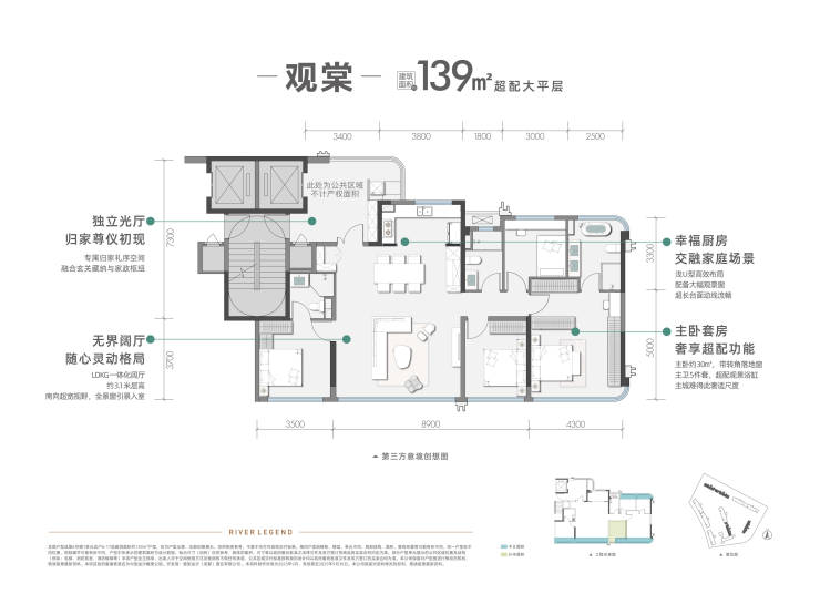 5.户型设计适配高端改善:只有139㎡和180㎡两种四房改善户型,层高均达3.1米。139㎡可改造出8.9米超宽横厅,主卧带浴缸;180㎡户型有17.4米超大面宽,搭配6.8米宽河景客厅,还设悬浮花园等,能实现“一户三院”的墅居体验。