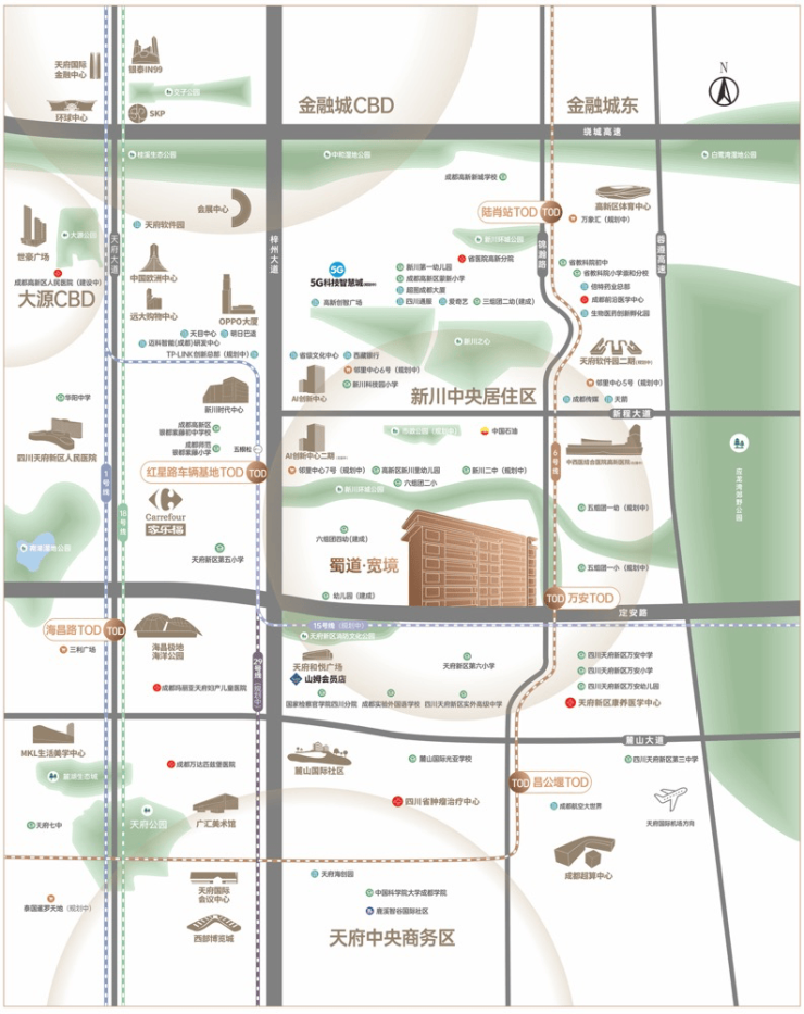项目立足高新区新川创新科技园南核芯,地处 “金融城 + 大源 + 天府新区” 黄金交汇点,享受国家级新区与国际合作园区双重战略红利。板块作为新加坡与四川合作的首个科技园区,定位 “世界交融之城”,以 “像素城市 + 园中之城” 理念打造,50% 为不可出让的绿化与基建用地,住宅用地仅占 15%,稀缺性无可替代。区位上紧邻 “4 纵 4 横” 城市主干线,无缝衔接天府大道、剑南大道等交通动脉,30 分钟直达金融城、世纪城等核心商圈,15 分钟接驳双流国际机场,同时承接高新南高端产业人口外溢,汇聚全球高科技人才,城市界面国际化、居住氛围纯粹,是成都 “宜居属性 + 产业赋能 + 稀缺土地” 三重优势兼具的核心板块。