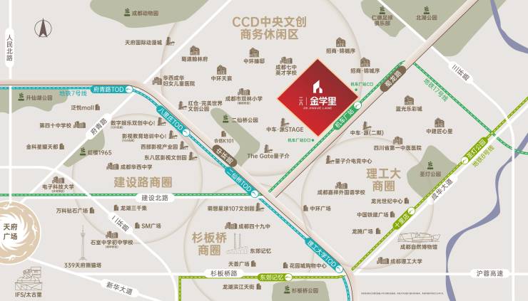 •成华大道、中环路、蜀龙大道三大主干道环伺。紧邻二仙桥TOD(规划中),更有17号线、7号线、8号线三地铁环绕,每日超5000人次地铁通勤客流在此汇聚转换。