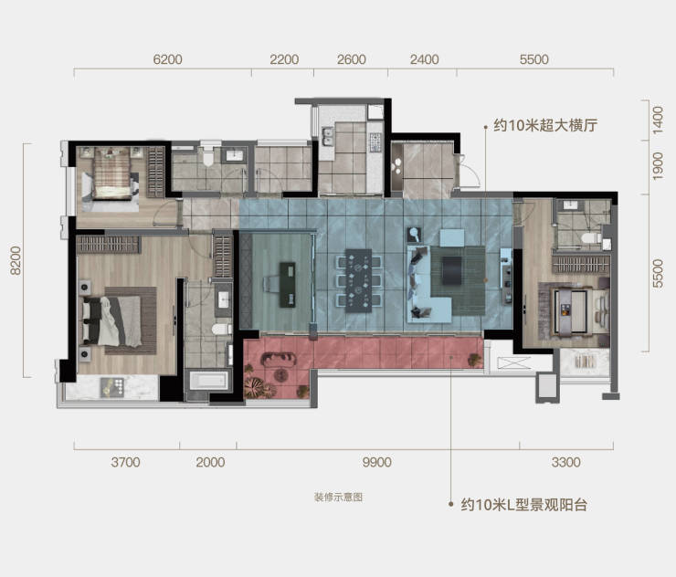 LDB+灵动空间形成约10米超大横厅,配10米长L型跑道式景观阳台阳台