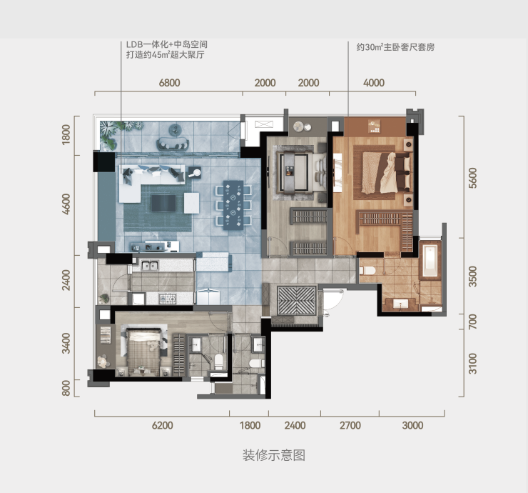 LDB一体化+中岛空间,打造约45㎡超大聚厅