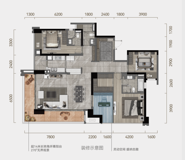 客厅约7.8米Pro级面宽,配罕见超14米长转角阳台,独有全面屏视野: