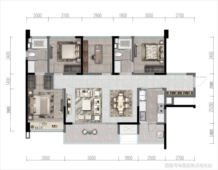 C户型 建面约142㎡ 四室两厅两卫(西北朝向)
