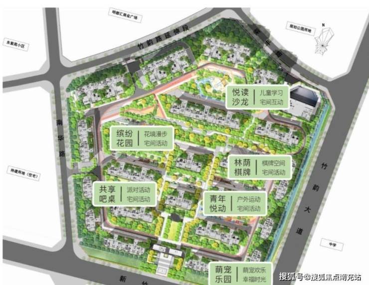 ?一轴一环六园,中轴对称,充满仪式感生活主景观轴;长约700米环形健身跑道串联中庭景观;楼栋间打造六大主题花园,全新社交娱乐空间。